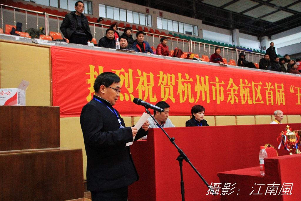 开幕式由余杭区武术协会主席王云炳先生主持,余杭区文广新局党委书记冯玉宝先生致开幕辞,浙江省武术协会副主席陈顺安先生致辞祝贺,运动员代表鲍忠娣女士和裁判员代表李宏女士分别代表运动员和裁判员宣誓,大赛总裁判长封更康先生宣讲了本次比赛的纪律与要求。在开幕式上领导们为五常街道颁发了“贡献奖”奖杯,还为获得本次比赛团体一、二、三等奖的团队颁发了奖杯。最后有余杭区原副区长,区武术协会名誉主席钱杭根先生宣布:余杭区首届“五常杯”传统武术比赛开幕!